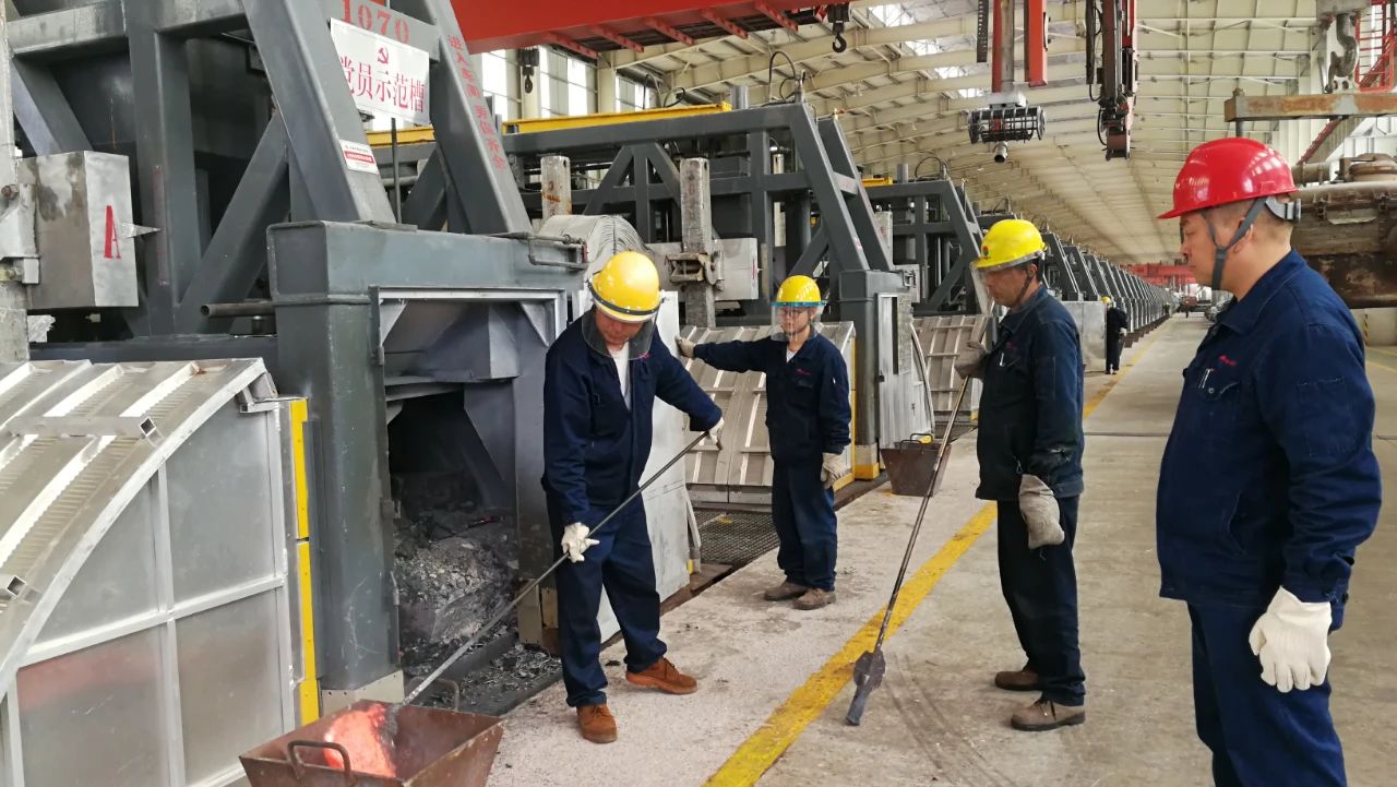 據悉,為確保二工段116臺電解槽安全高效快速啟動,廣元中孚項目部統籌協調、全面動員,要求每名管理人員深入基層,分包責任槽,傾盡所能為一線員工提供幫助。在啟動現場,記者看到,全體黨員干部把鮮艷的紅旗插到電解槽旁,與一線員工融為一體,不懼艱難,沖鋒陷陣,強力推進投產進程。現場干部員工一起裝爐、封料、撈碳渣、調參數,每項操作都扎扎實實、一絲不茍。他們身上的工作服被汗水浸透,白皙的臉龐被熱氣烤得通紅,但他們全然不顧,依然忘我地忙碌著。沸騰的電解質在槽內上下翻滾,火眼內不時噴發出強勁有力的藍色火苗,無不昭示著企業美好的發展前景。