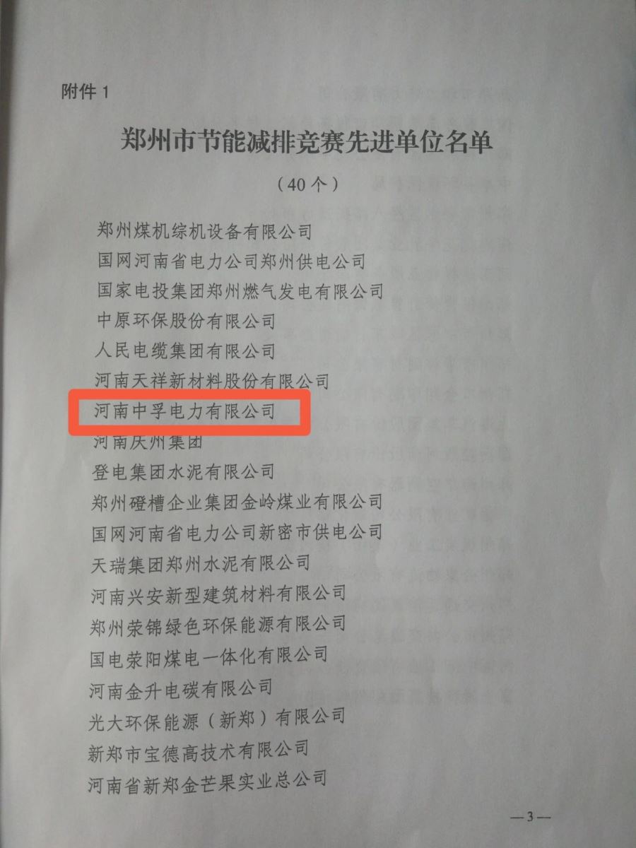 中孚電力公司被評為“鄭州市節(jié)能減排競賽先進單位”