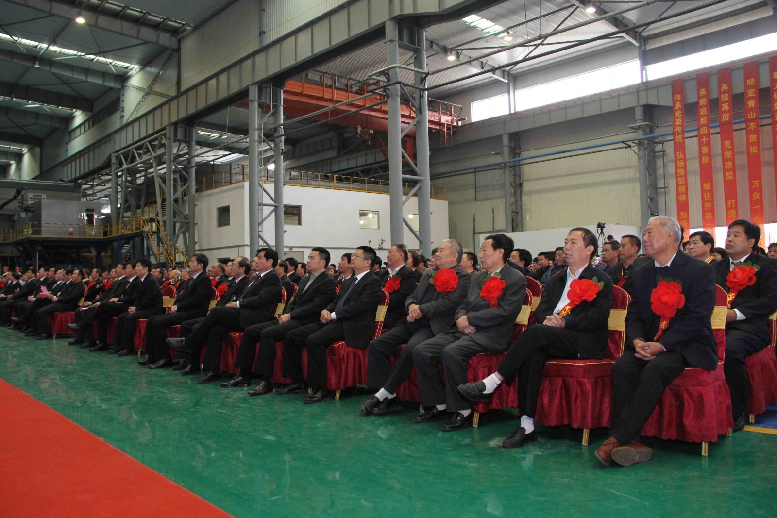 在煥然一新的高精鋁冷軋車間門前,100余家合作單位的祝賀條幅垂直懸掛在廠房前方,代表著社會各界的良好祝愿。慶典大會現場喜慶熱烈,“誠信為本,一體雙翼,譜四十華章員工安居樂業;創新發展,轉型升級,追百年夢想豫聯基業長青”的大幅對聯熠熠生輝?! ?br /> 9時許,慶典大會在充滿喜慶的鞭炮聲中拉開序幕。會議首先播放了題為《未來鋁世界》的宣傳片,專題片恢弘大氣,回顧了企業風雨歷程,展望了未來美好發展前景。中國有色金屬工業協會等國際、國內110多家單位為公司發來賀信,集團公司總經理王元明宣讀了中國有色金屬工業協會、鞏義市委市政府和大股東ViHolding公司的賀信。中孚實業董事長賀懷欽宣讀了《關于表彰豫聯集團四十年建設發展功臣人物的決定》,對在不同時期為企業做出突出貢獻的80名功臣進行大力表彰,并頒發獎牌及榮譽證書。擴建指揮部副指揮長張榮珍、中孚實業副總經理張松江、高精鋁公司生產總監錢宇分別結合自己在企業的工作經歷做了典型發言,情真意切,感人至深。