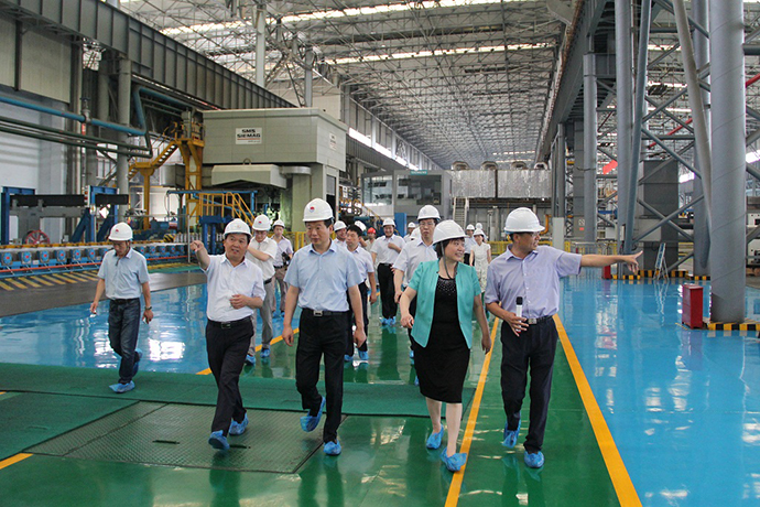 在豫聯工業園區觀景臺,賀懷欽董事長首先向王寶玉市長一行介紹了豫聯工業園區的基本情況。隨后,王寶玉市長查看了電力公司集控室、鋁業400KA生產線,并興致勃勃地深入轉型升級項目高精鋁公司生產現場,重點考察了生產工藝流程、高端市場開發、鋁精深加工產品應用情況。