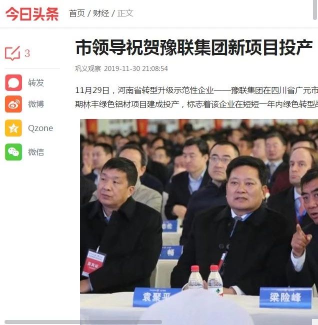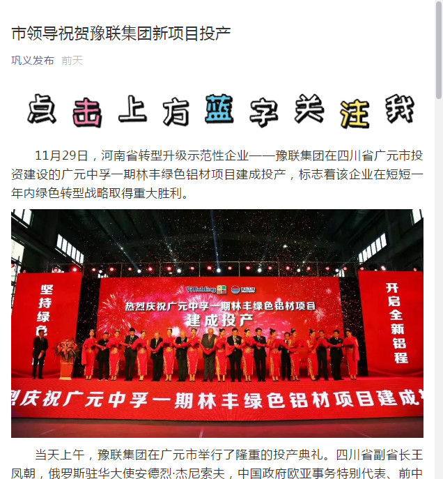 連日來,豫聯(lián)集團(tuán)廣元中孚一期林豐綠色鋁材項(xiàng)目建成投產(chǎn)的消息被中華人民共和國中央人民政府網(wǎng)、新華社、新華網(wǎng)、人民網(wǎng)、中國證券網(wǎng)、中國有色金屬報(bào)、河南日報(bào)、鞏義市人民政府網(wǎng)等眾多主流媒體廣泛宣傳、轉(zhuǎn)載報(bào)道。