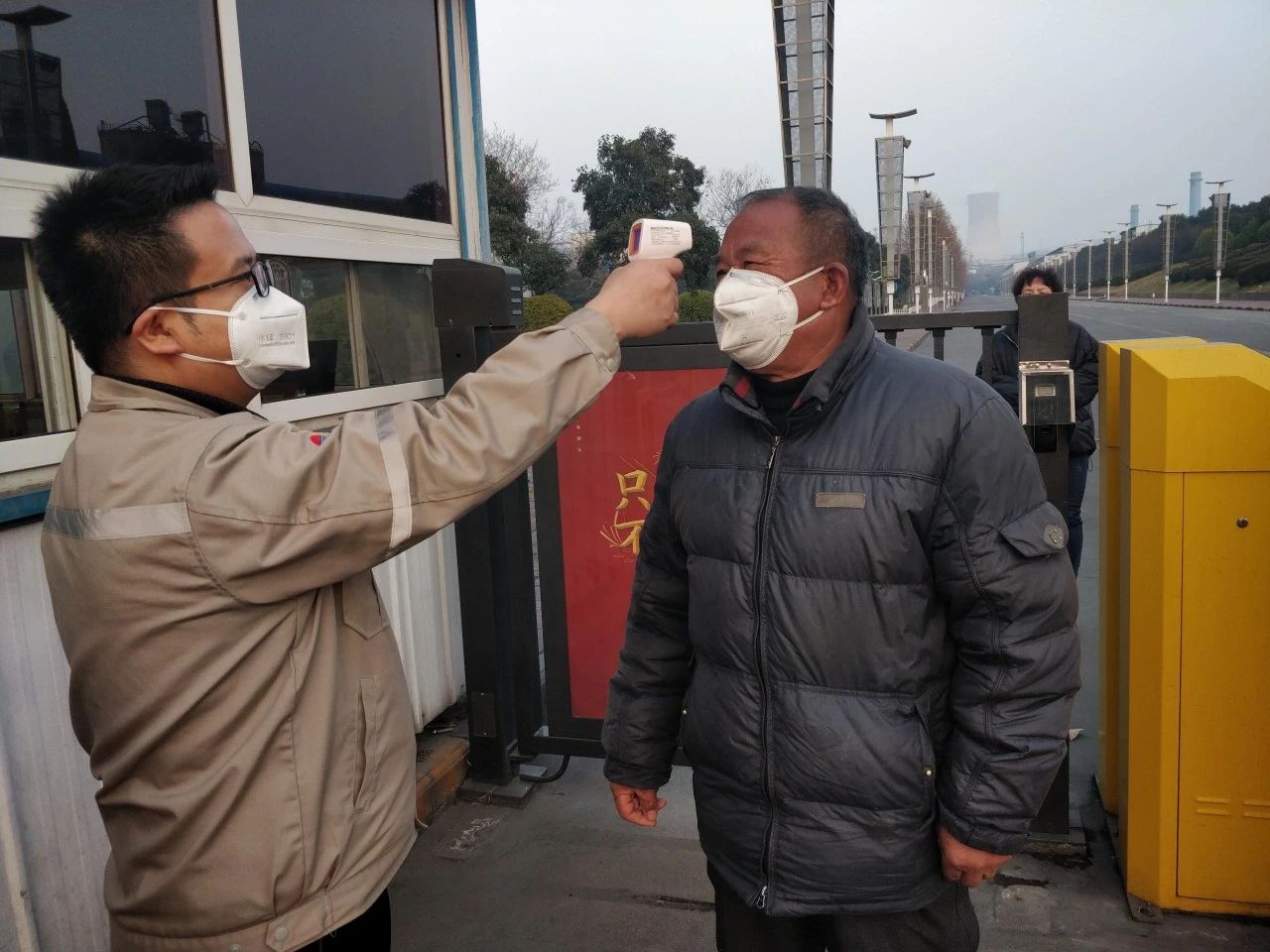王政(左一)在公司門崗對出門人員進行體溫檢測
