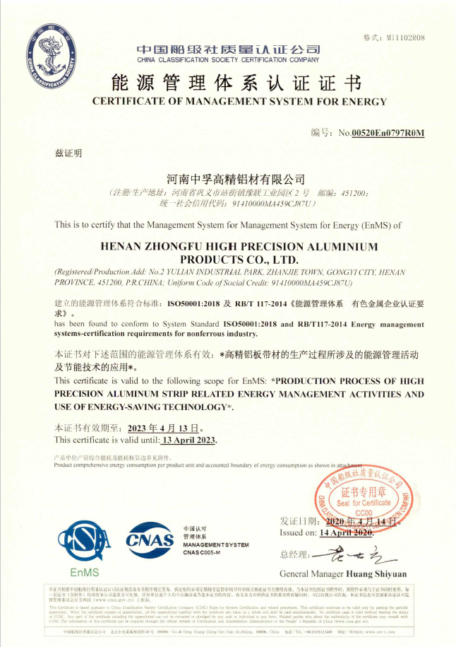 近日,中孚高精鋁材公司收到了中國(guó)船級(jí)社質(zhì)量認(rèn)證公司頒發(fā)的《能源管理體系認(rèn)證證書(shū)》,標(biāo)志著公司建立的能源管理體系符合標(biāo)準(zhǔn)ISO50001:2018及RB/T 117-2014《能源管理體系有色金屬企業(yè)認(rèn)證要求》。